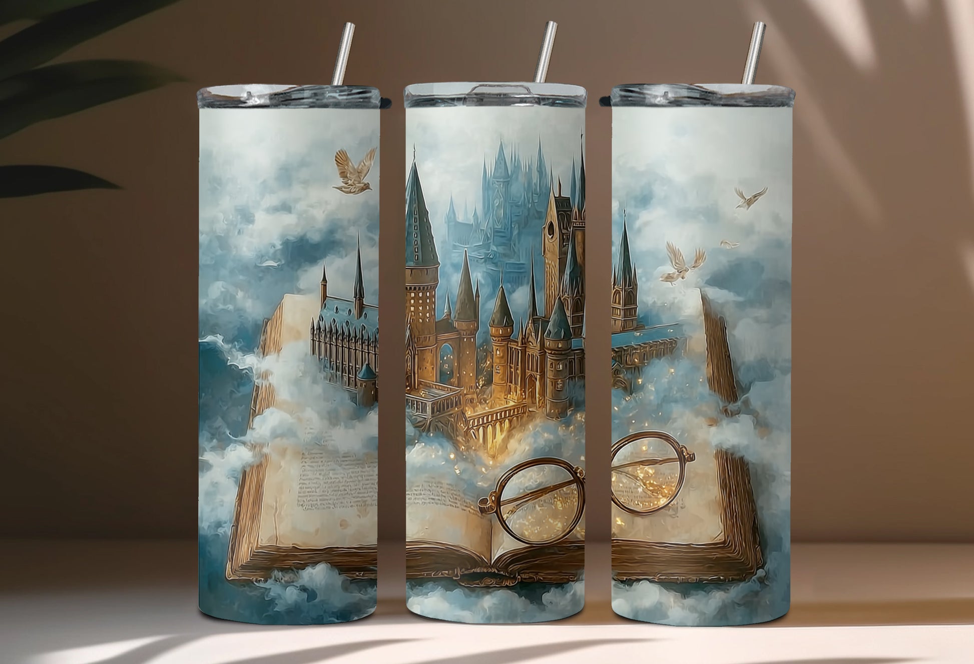 This 20 oz. stainless steel tumbler features a magical design with a pair of round glasses sitting on an open book. In the background is a castle.