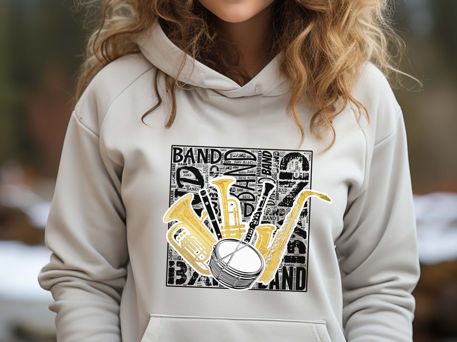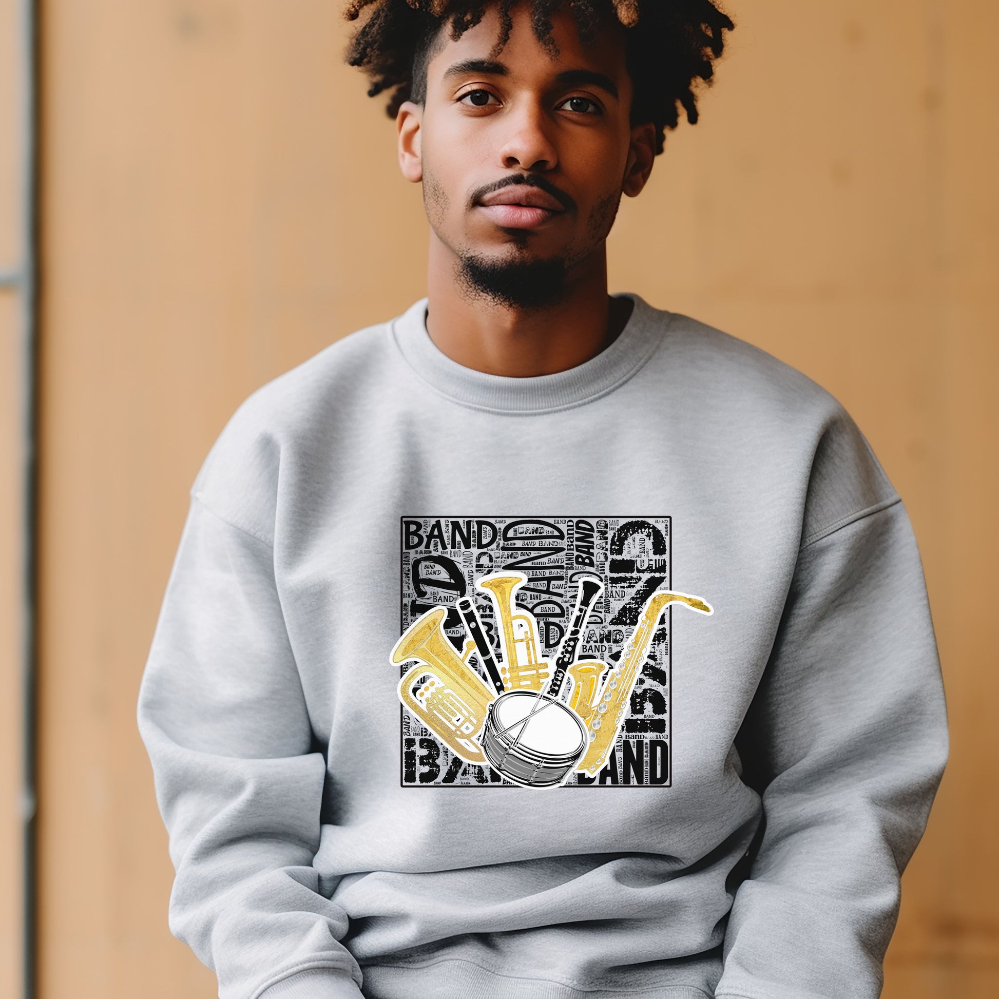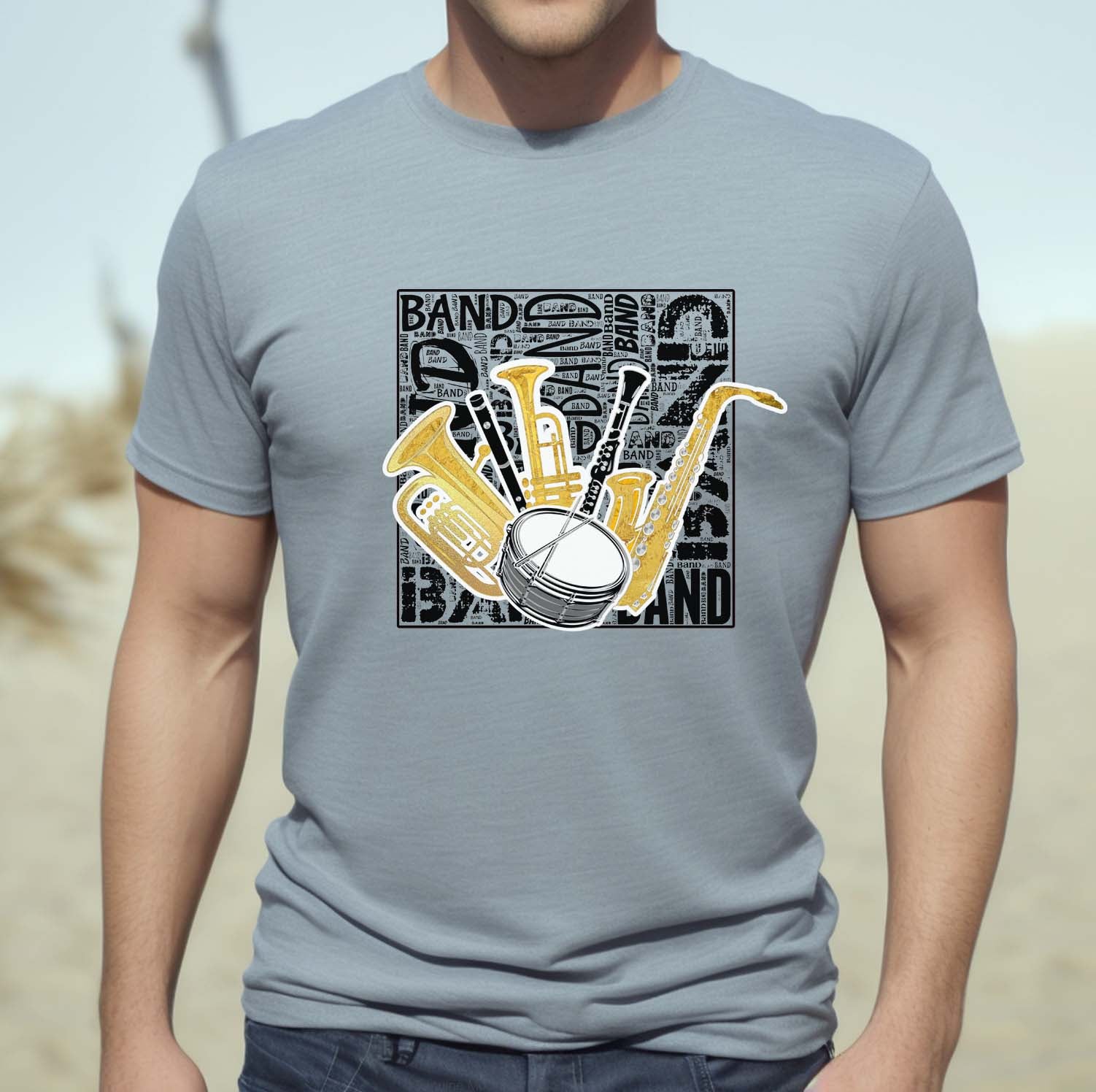 This grey shirt features various band instruments on a background of black band related words. It comes in a crew neck T-shirt, sweatshirt or hoodie in unisex sizes.