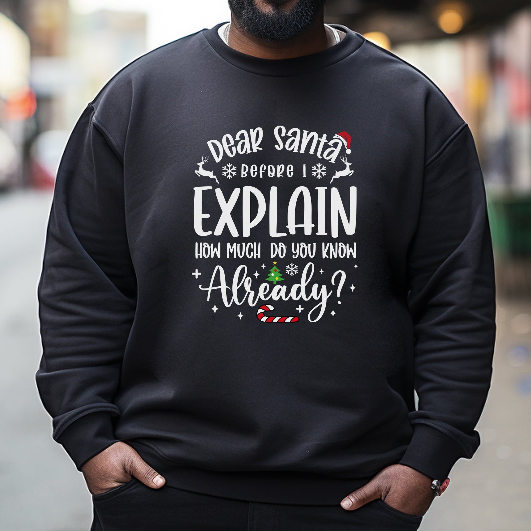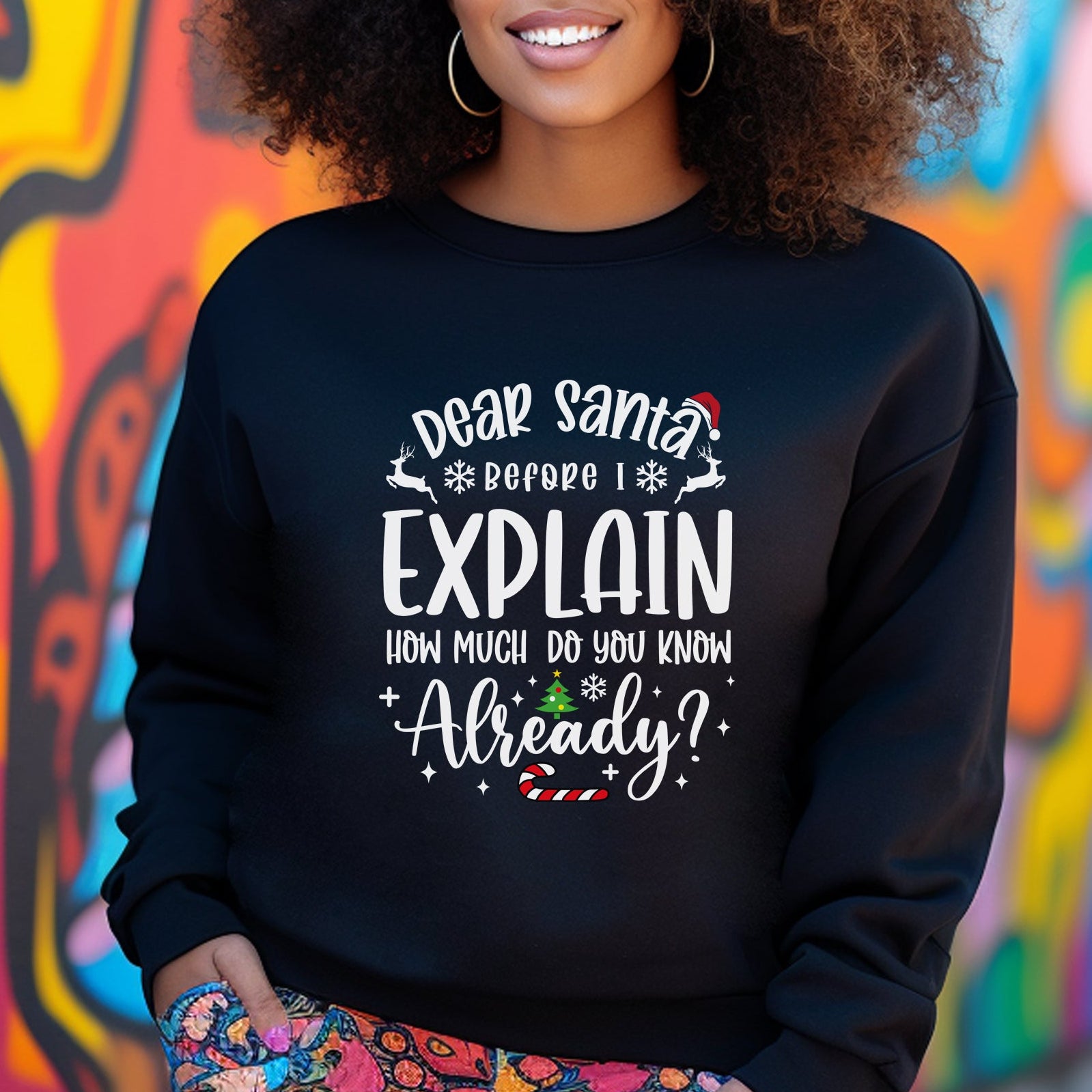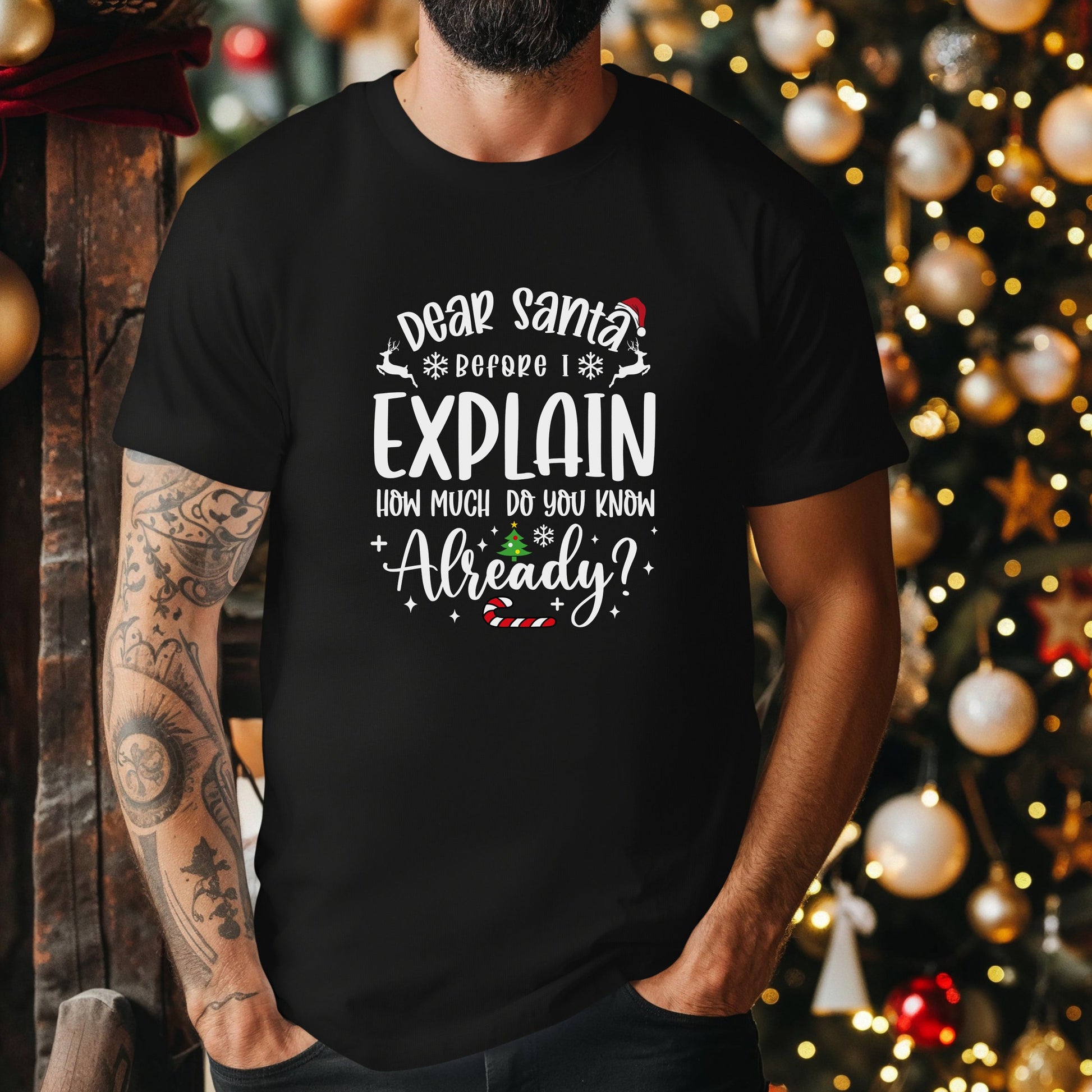 Do you have a few things you need to explain to Santa? Get this funny black shirt in your choice of a crew neck T-shirt, sweatshirt or hoodie in unisex sizes.