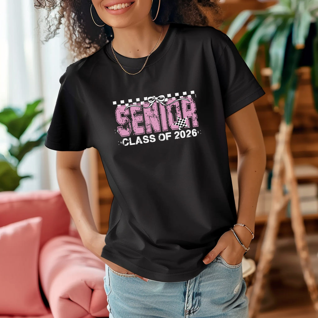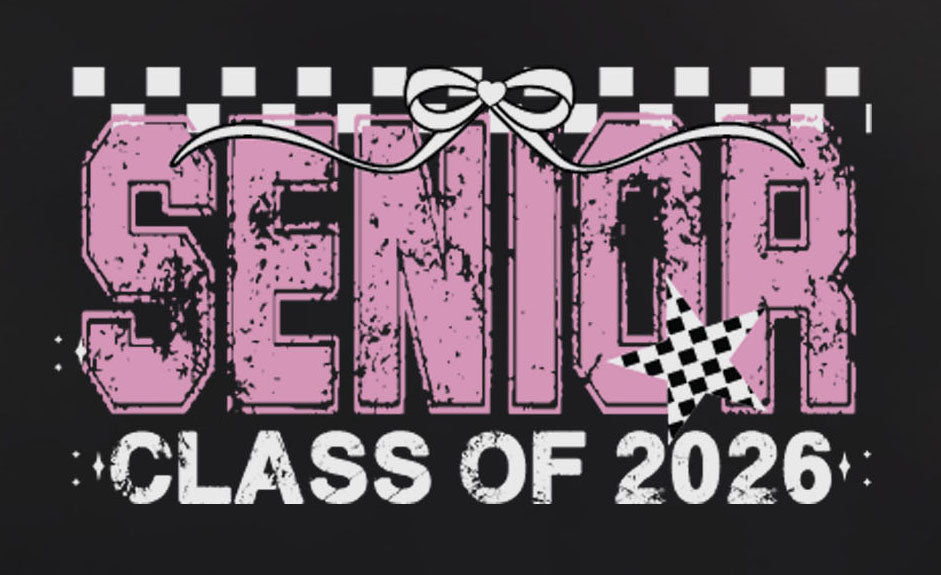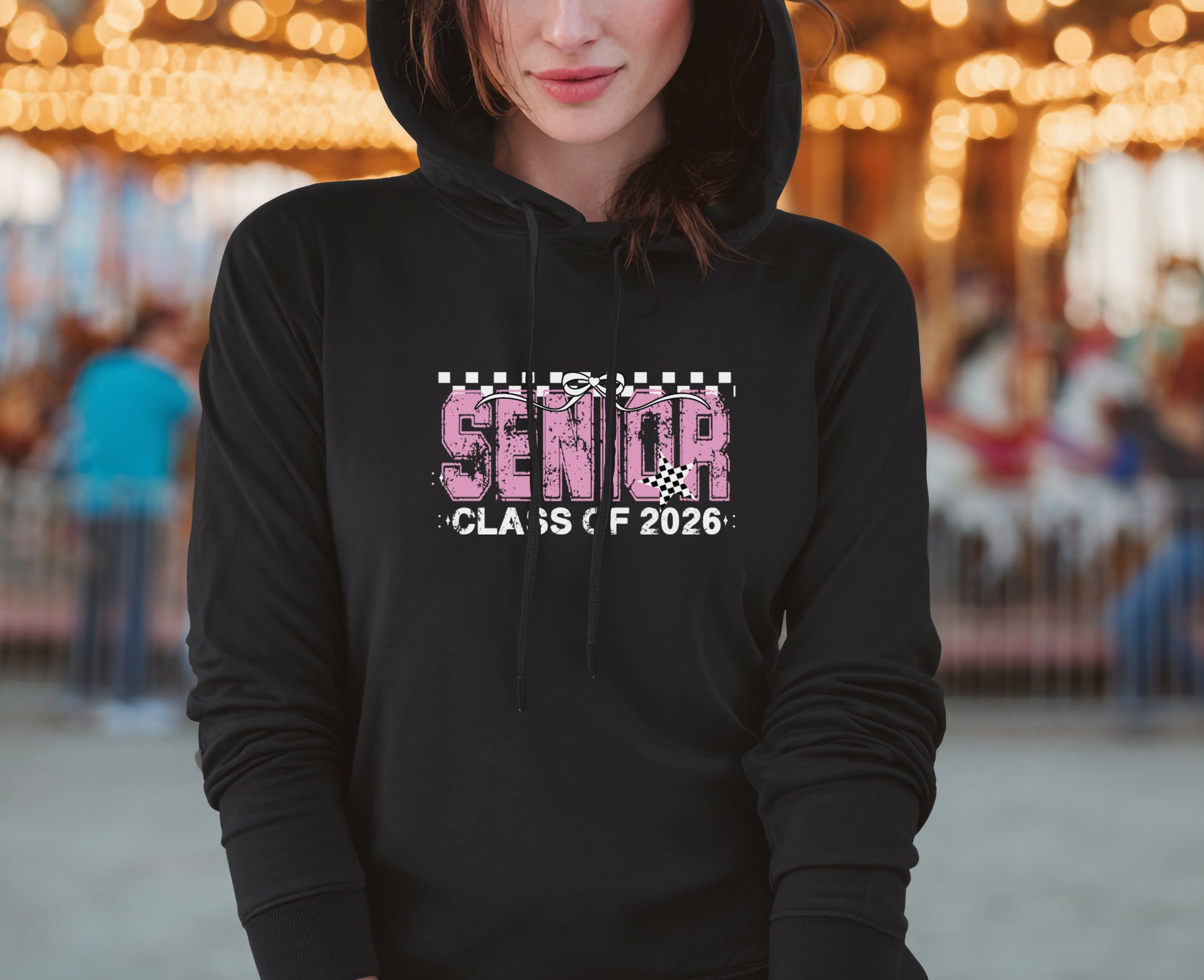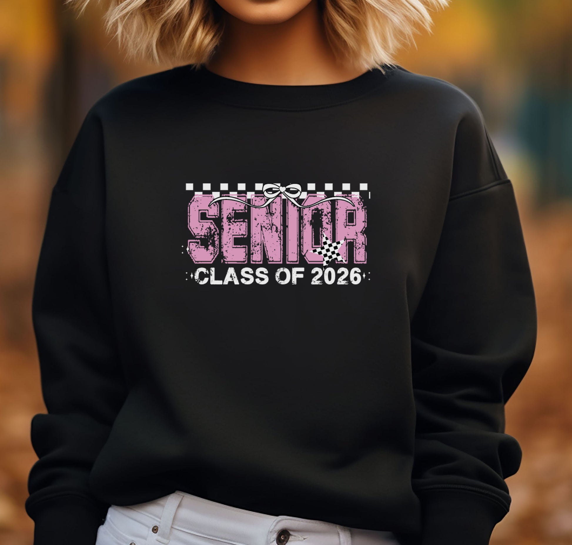 This black shirt has the word "SENIOR" in distressed pink. Over it is a white checkered pattern. Under the words senior are the words "Class Of 2026" in white. It comes in your choice of a crew neck T-shirt, sweatshirt or hoodie in unisex sizes.