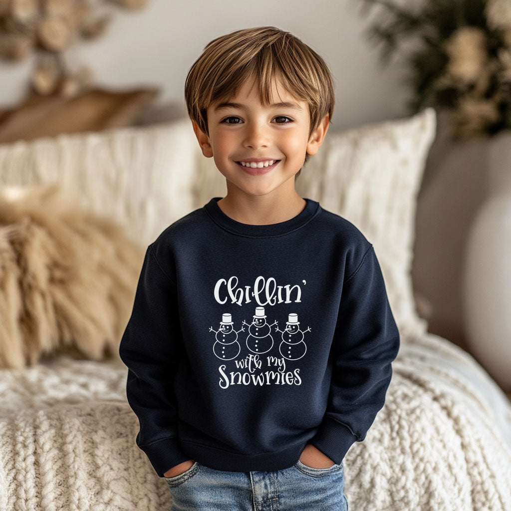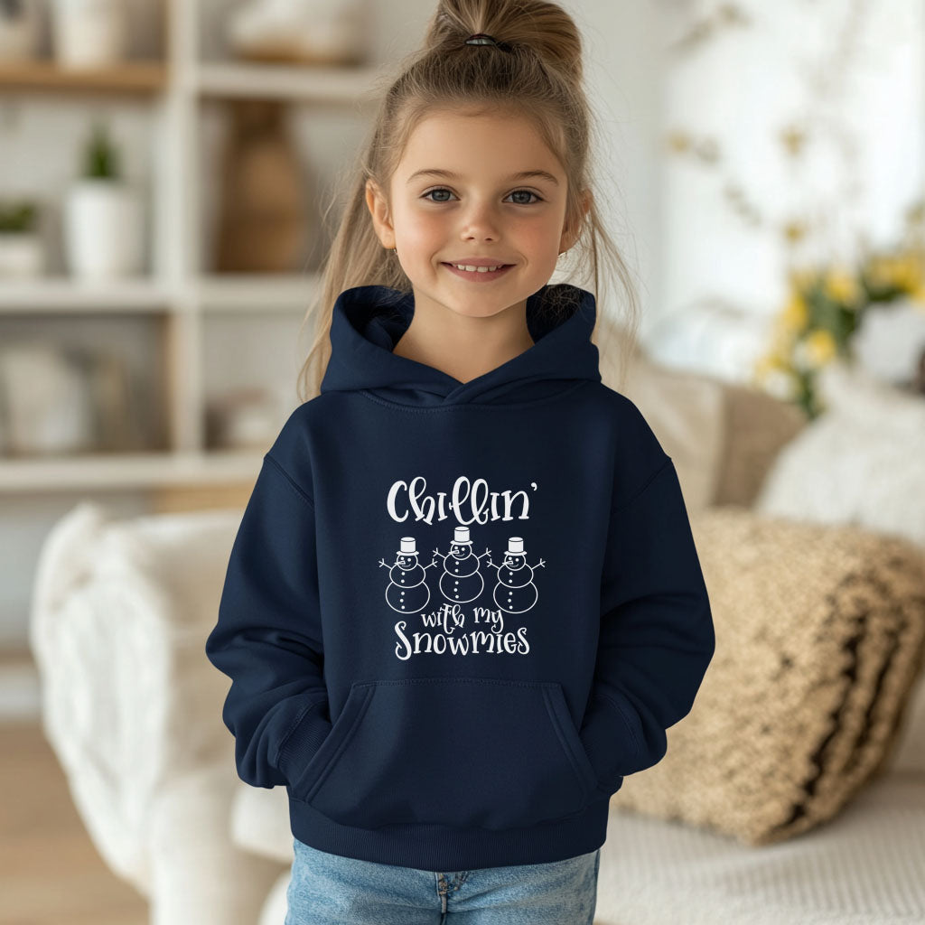 Who are you chillin with when it gets cold? This navy-blue shirt is available in a sweatshirt or hoodie in kids' unisex sizes.