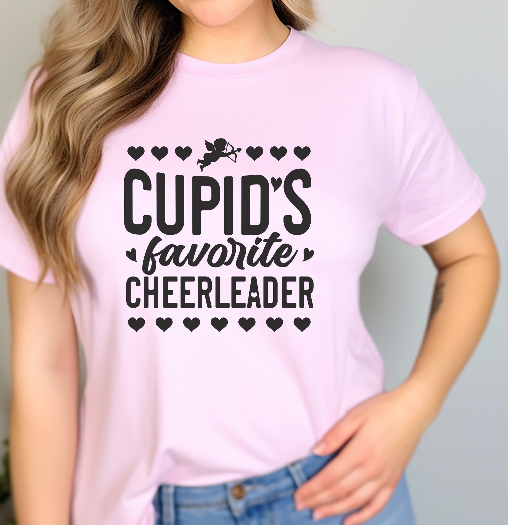 Let everyone know that you're cupid's favorite cheerleader with this light pink shirt! It comes in your choice of a crew neck T-shirt, sweatshirt or hoodie in unisex sizes.