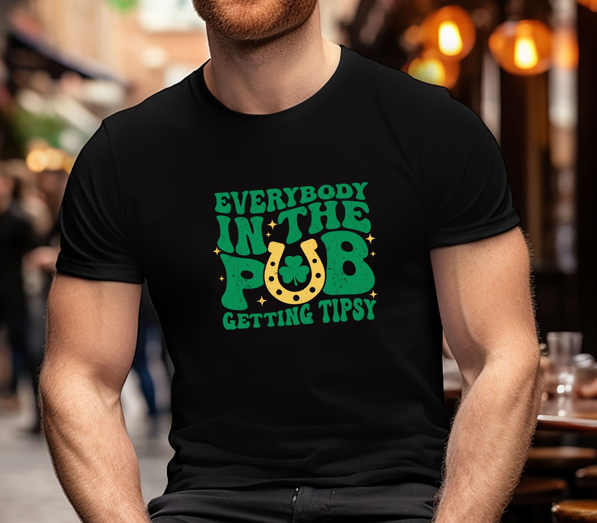 This black shirt features a St. Patrick's Day themed design with the text "EVERYBODY IN THE PUB GETTING TIPSY". The word "PUB" is stylized with a horseshoe and a clover. The colors are green and gold, with a slightly distressed or vintage texture. It comes in a crew neck T-shirt or sweatshirt in unisex sizes.