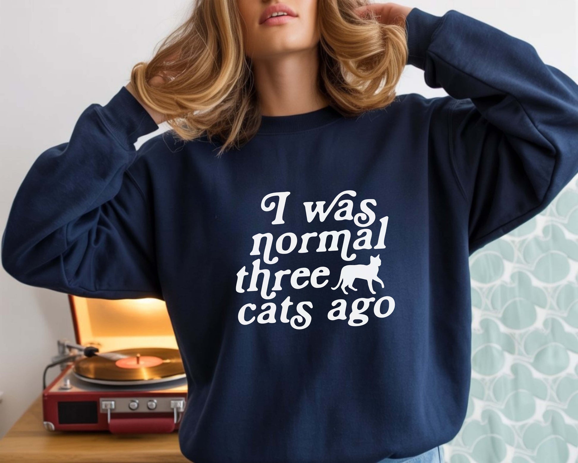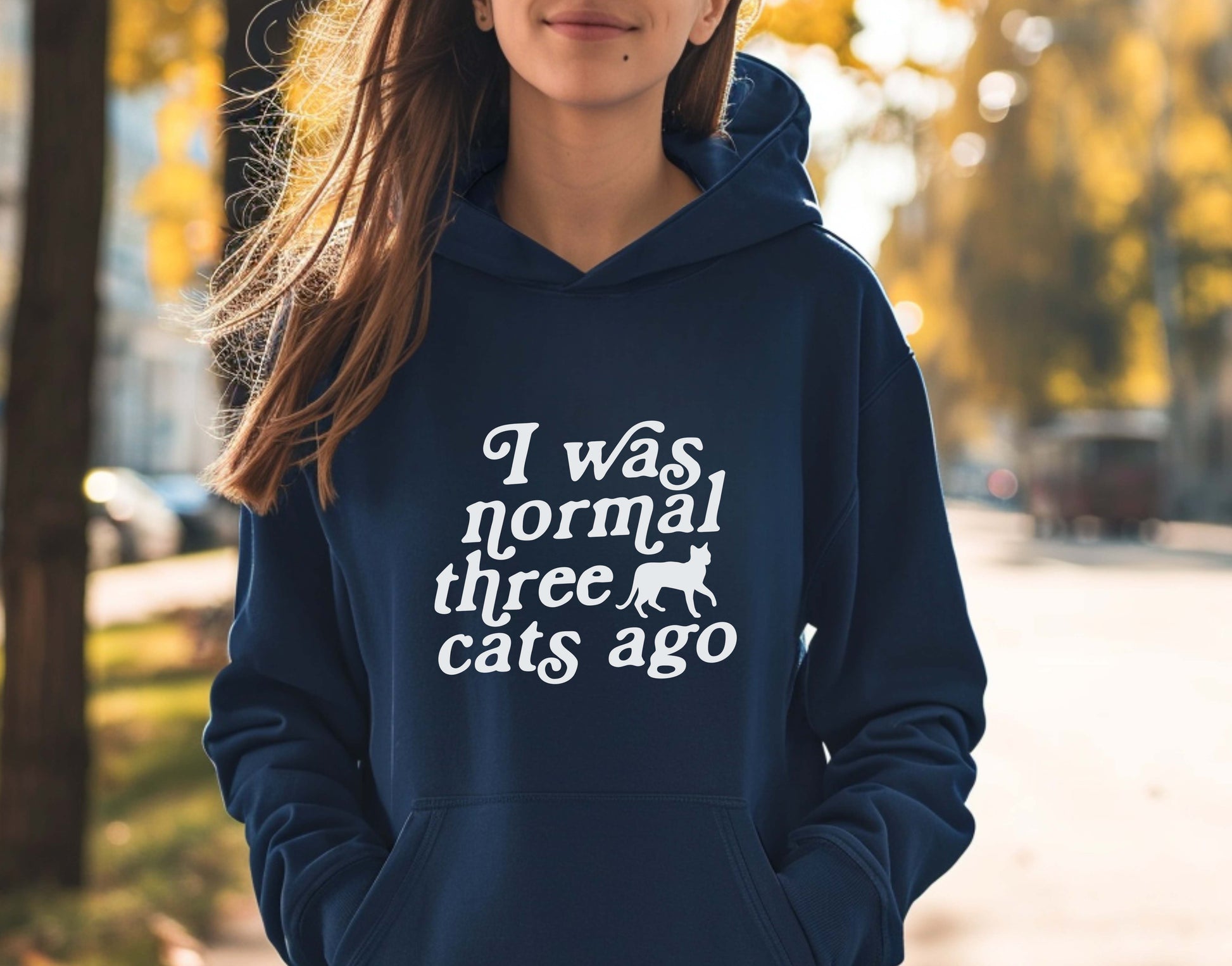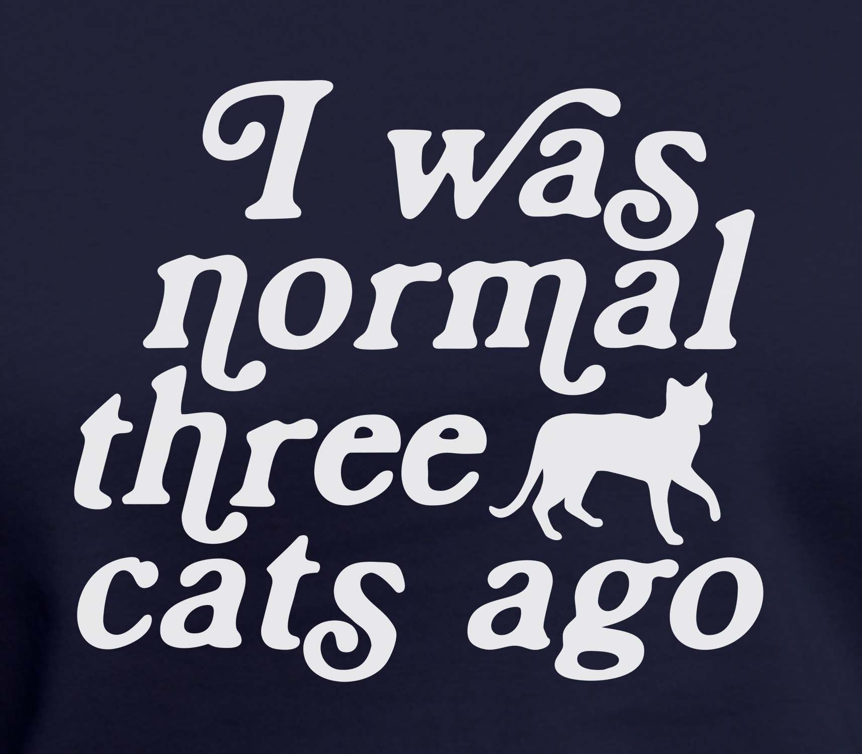 This navy-blue shirt says "I was normal 3 cats ago" in white with the silhouette of a cat walking. Get it in a crew neck T-shirt, sweatshirt or hoodie in unisex sizes.