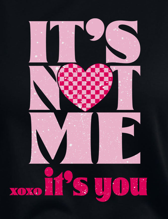 This black shirt features the words "It's Not Me...It's You in pink with a heart in place of the o in not. It's available in your choice of a crew neck T-shirt, sweatshirt or hoodie in unisex sizes.