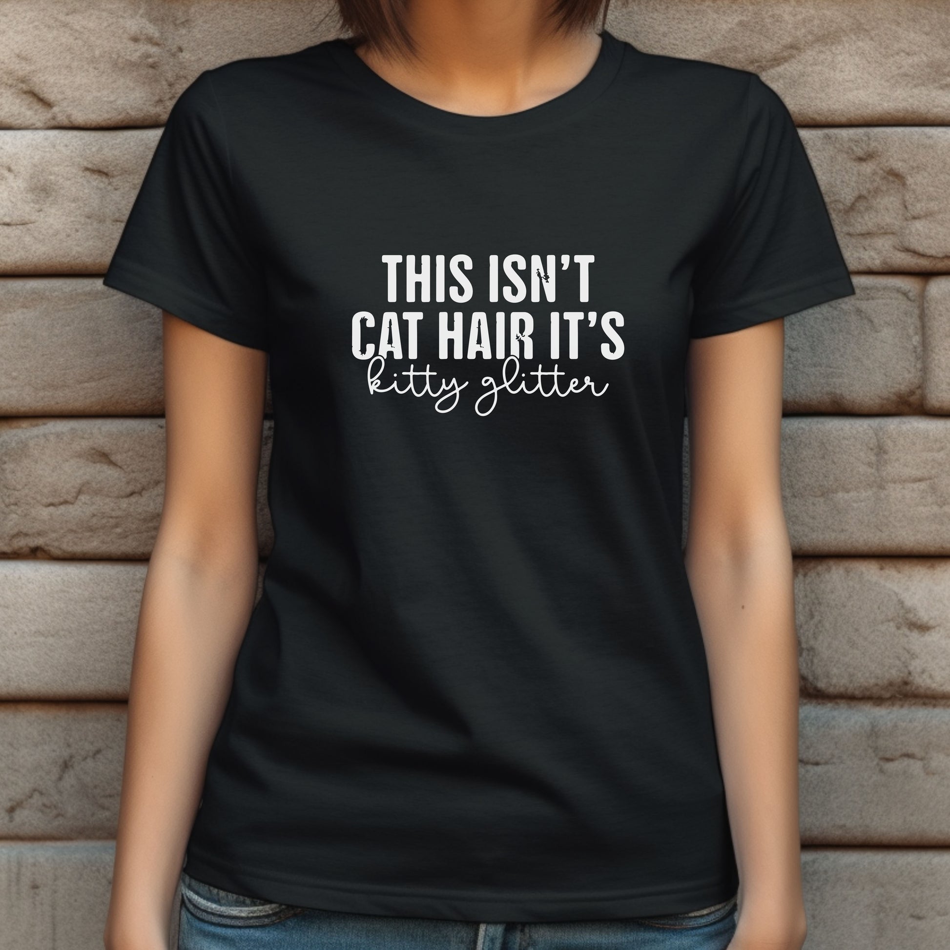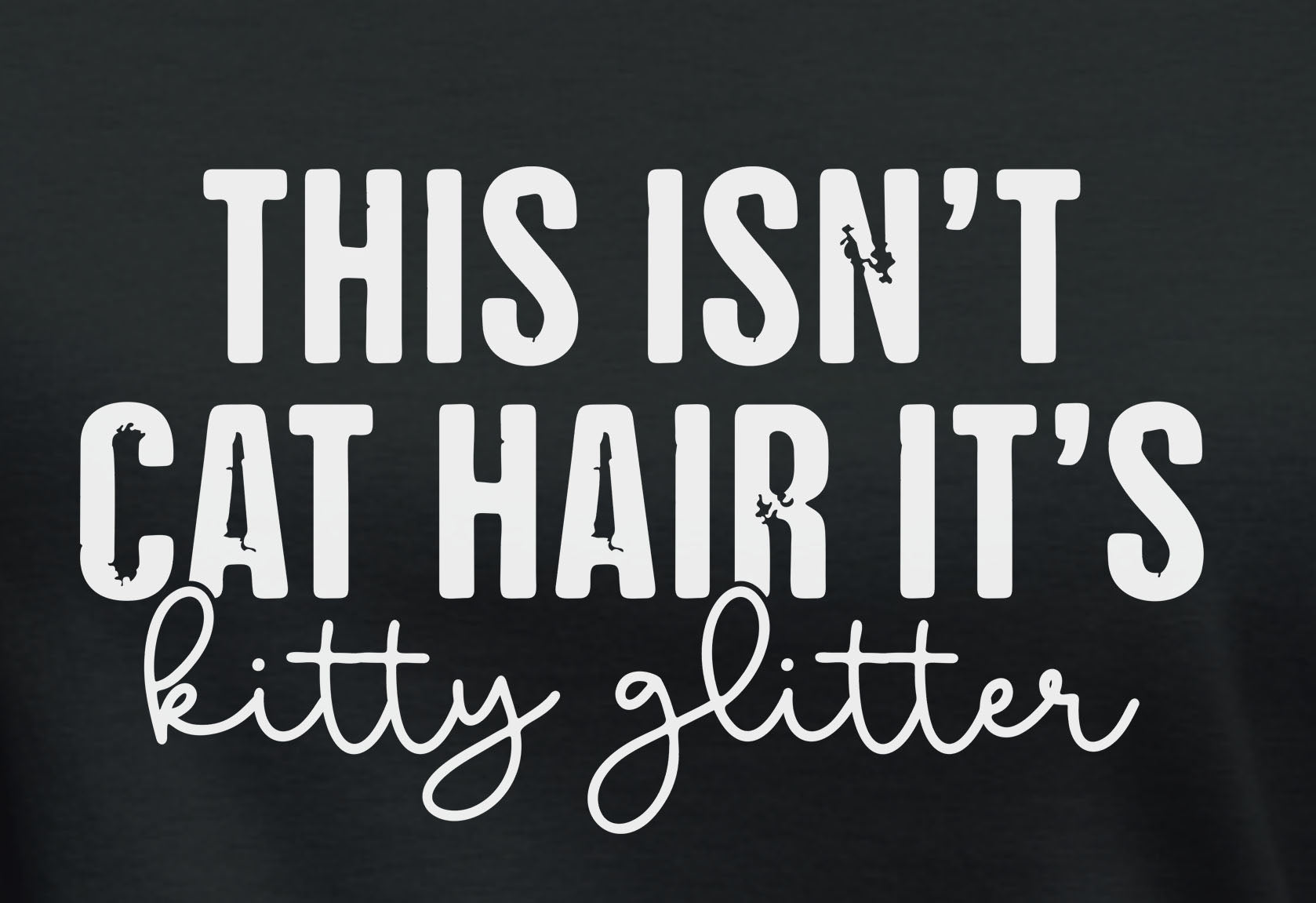This black shirt features the words "This isn't cat hair It's kitty glitter" in white. It's available in a crew neck T-shirt, sweatshirt or hoodie in unisex sizes.