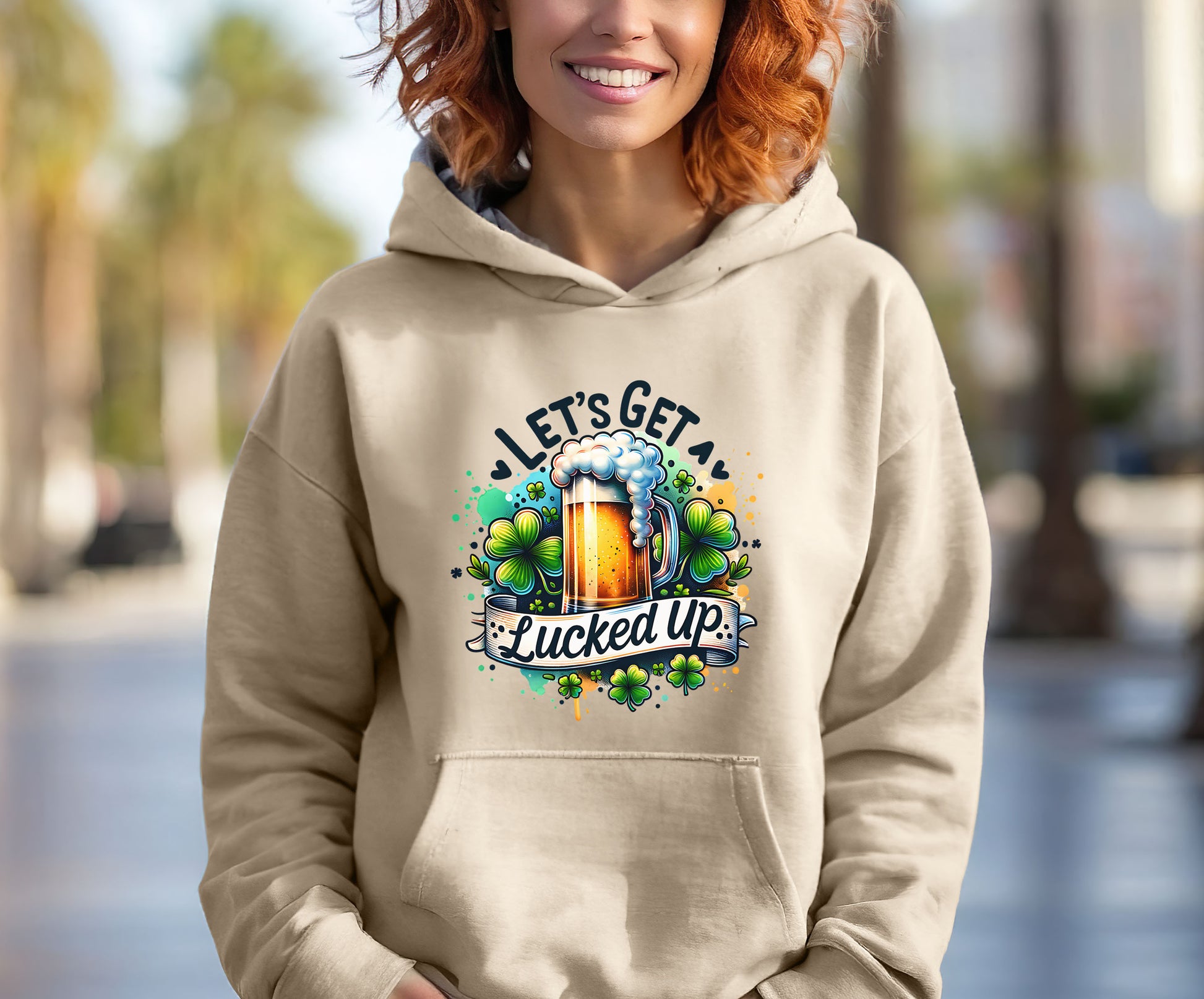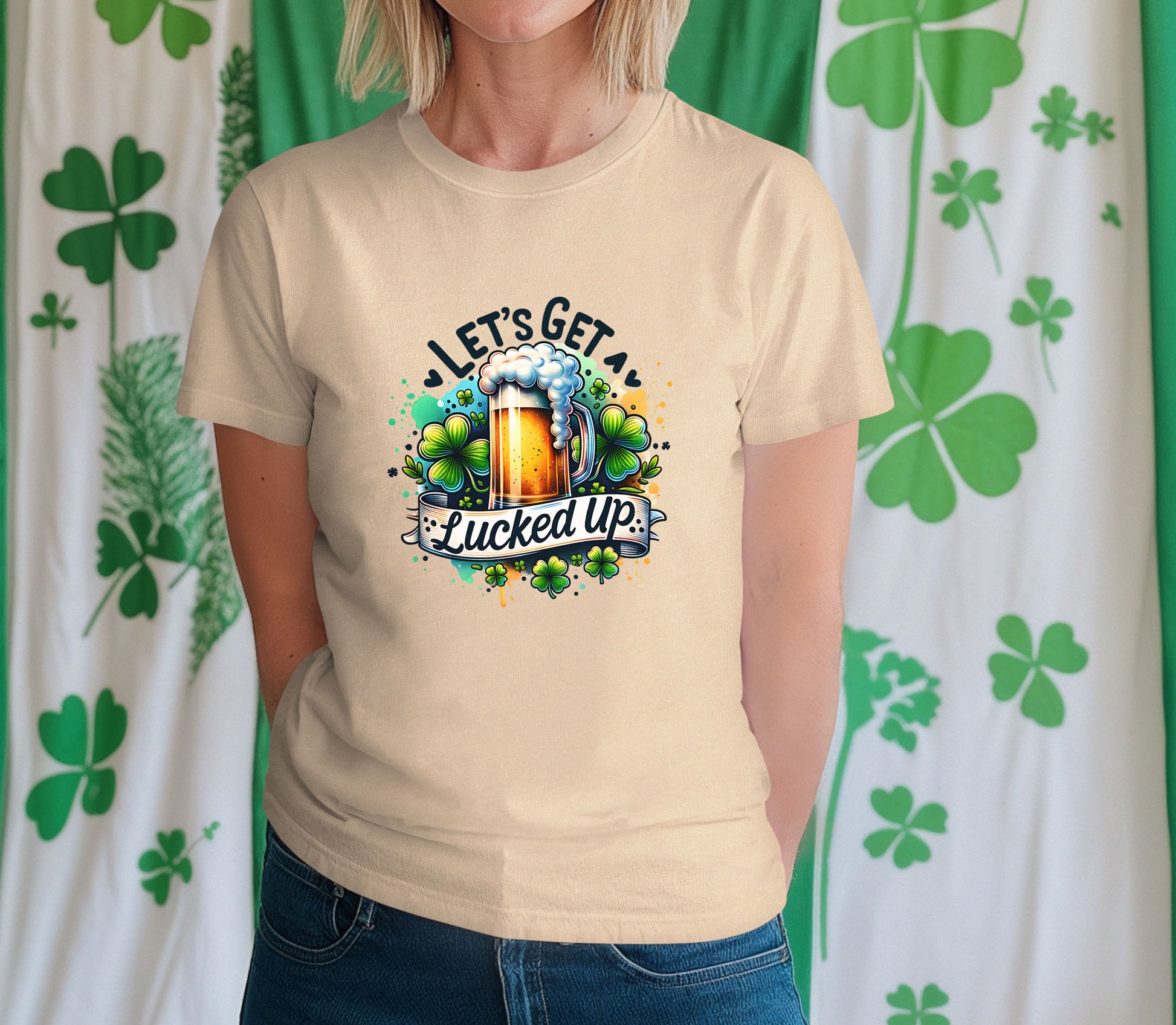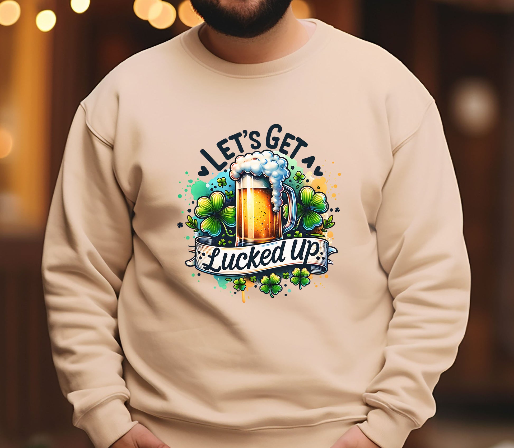 This sand-colored shirt features a mug of beer with some shamrocks in the background and the words "Let's Get Lucked Up" in black. It is available in a crew neck T-shirt, sweatshirt or hoodie in unisex sizes.