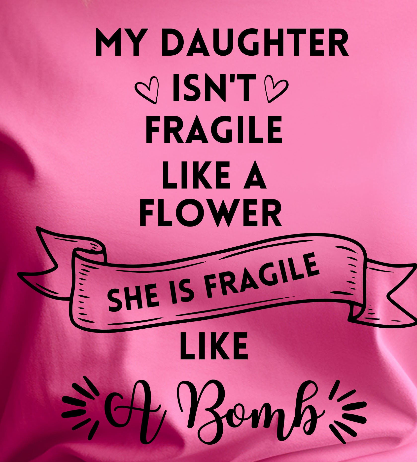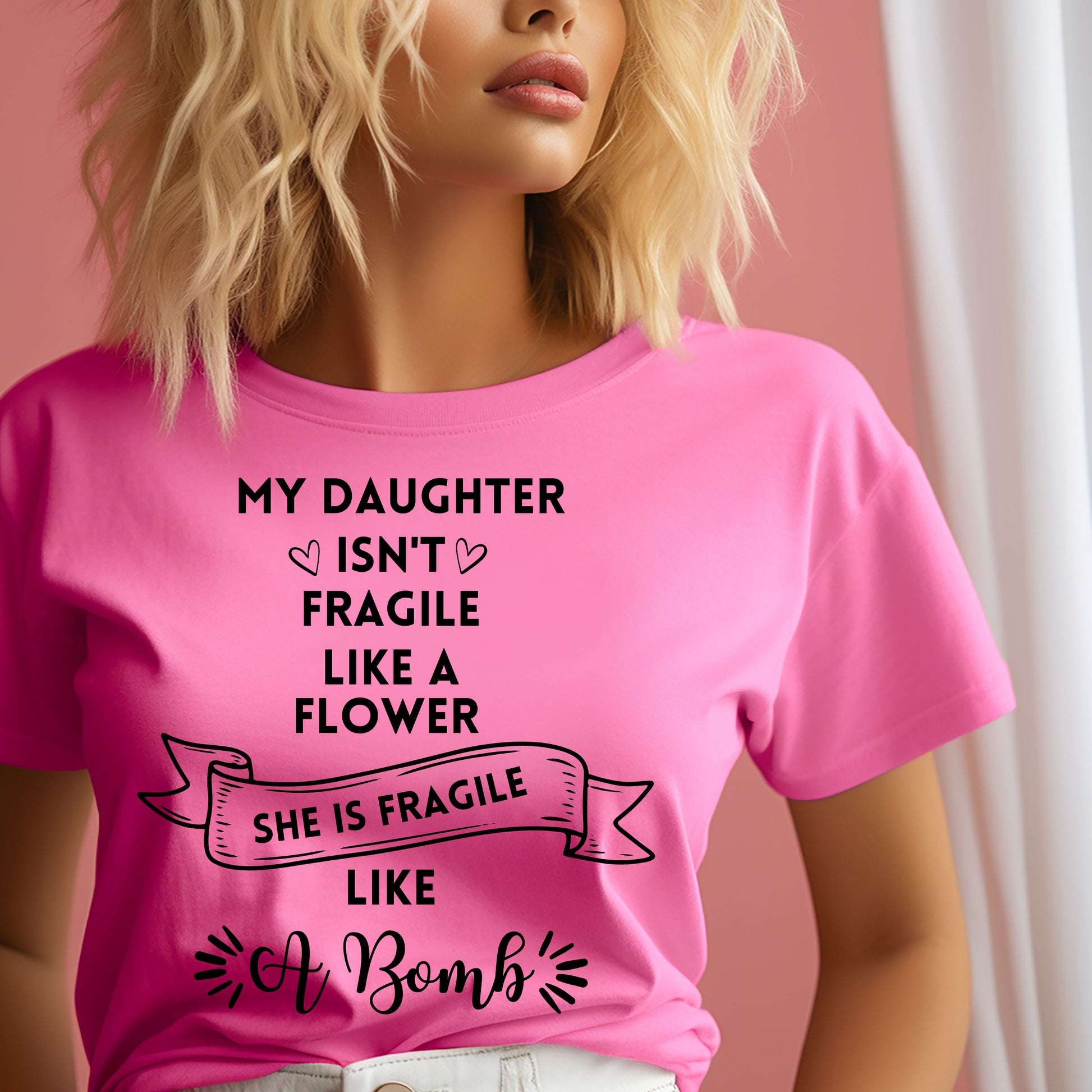 Celebrate your fierce little girl with our bright pink "My Daughter Isn't Fragile Like a Flower, She's Fragile like a Bombs" shirt! This playful and humorous design is perfect for moms who appreciate a touch of sass and strength. Made from soft, breathable fabric, it ensures all-day comfort while making a bold statement. Whether it's for a casual day out or a fun family gathering, this shirt is sure to spark smiles and conversations. Dress in style and show off your daughter's unique personality!