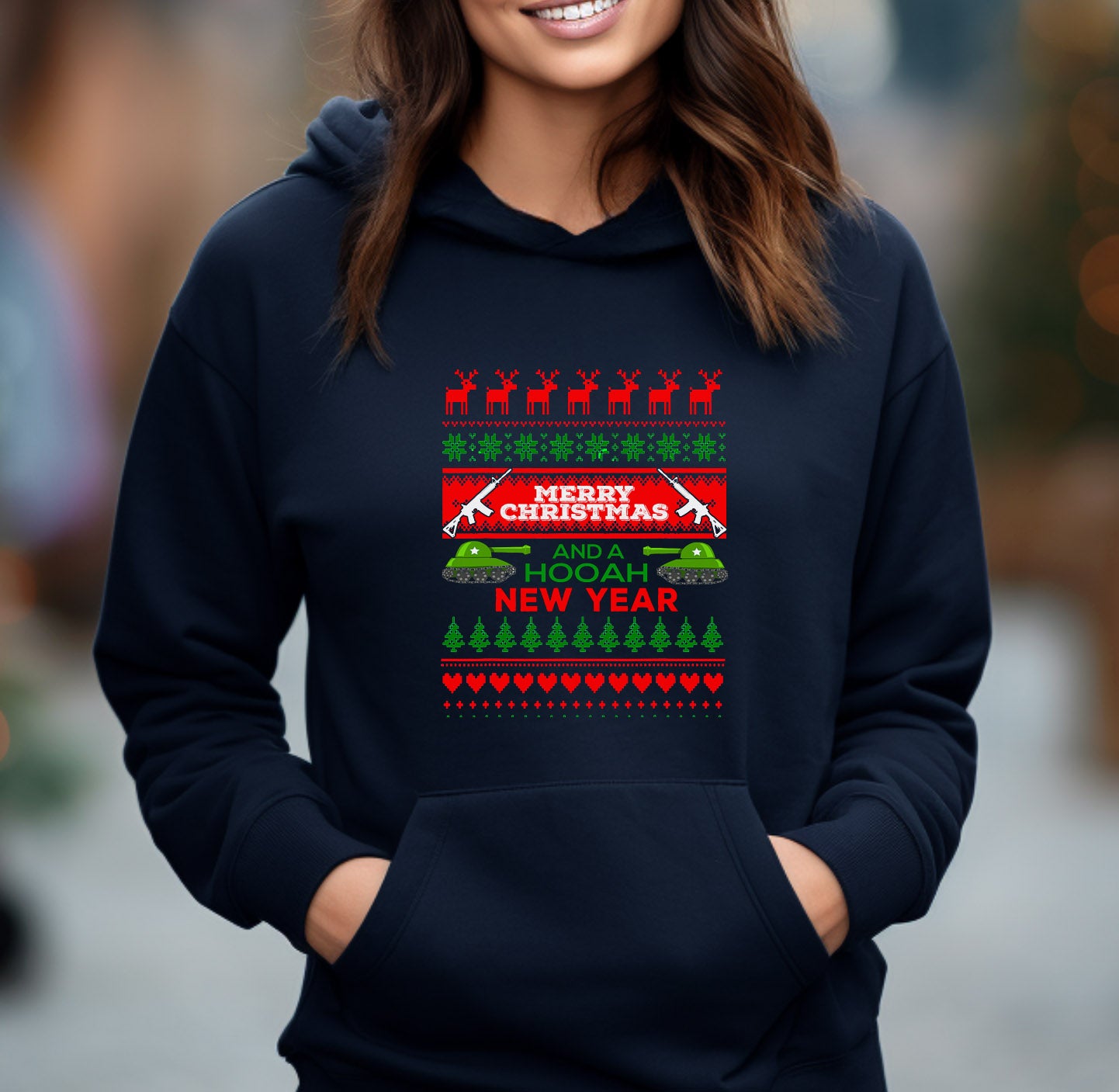 This black shirt is the perfect ugly Christmas sweater for anyone close to the military. Get it in a crew neck T-shirt, sweatshirt or hoodie in unisex sizes.