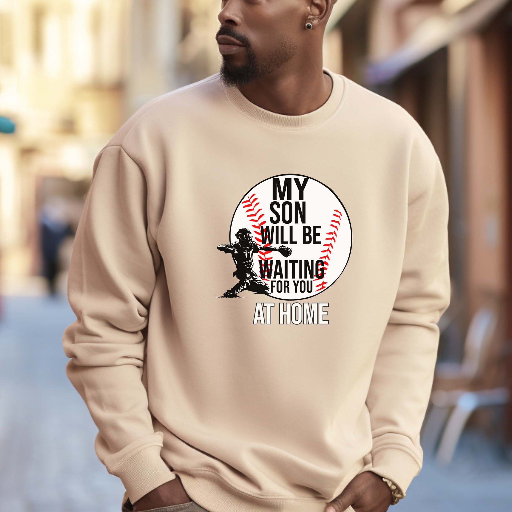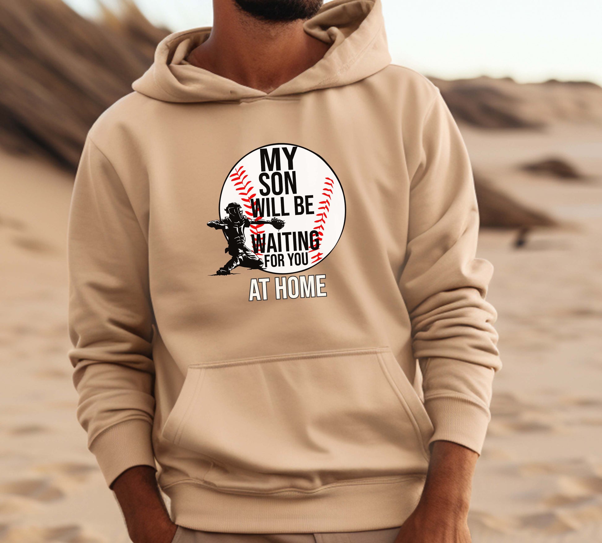Show off your love for baseball and family with our sand-colored t-shirt that proudly declares, "My son will be waiting for you at home." This comfortable and stylish top is perfect for game days or casual outings, making it a great addition to any baseball enthusiast's wardrobe. Crafted from soft, breathable fabric, it ensures all-day comfort while you cheer on your favorite team. Wear it with pride and let everyone know where your heart truly lies!