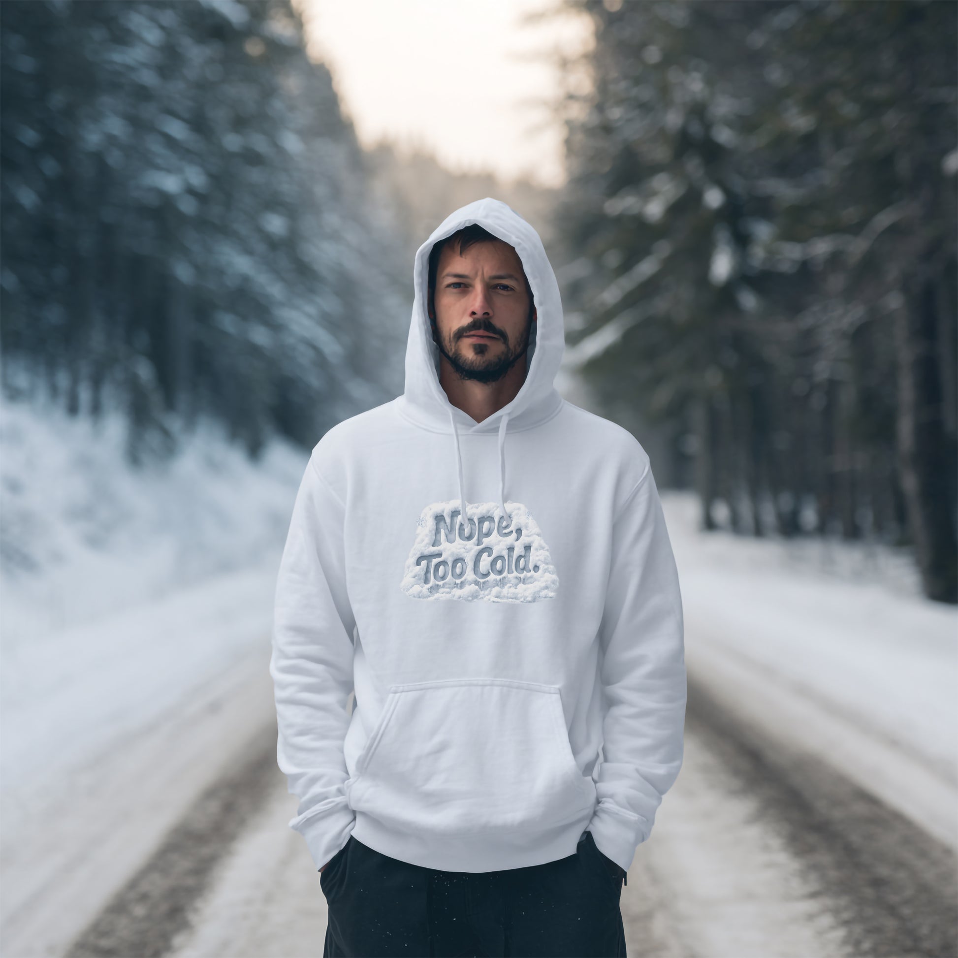This white shirt features a design that looks like a pile of snow with the words "Nope Too Cold" written in it. Get it in your choice of a sweatshirt or hoodie in unisex sizes.