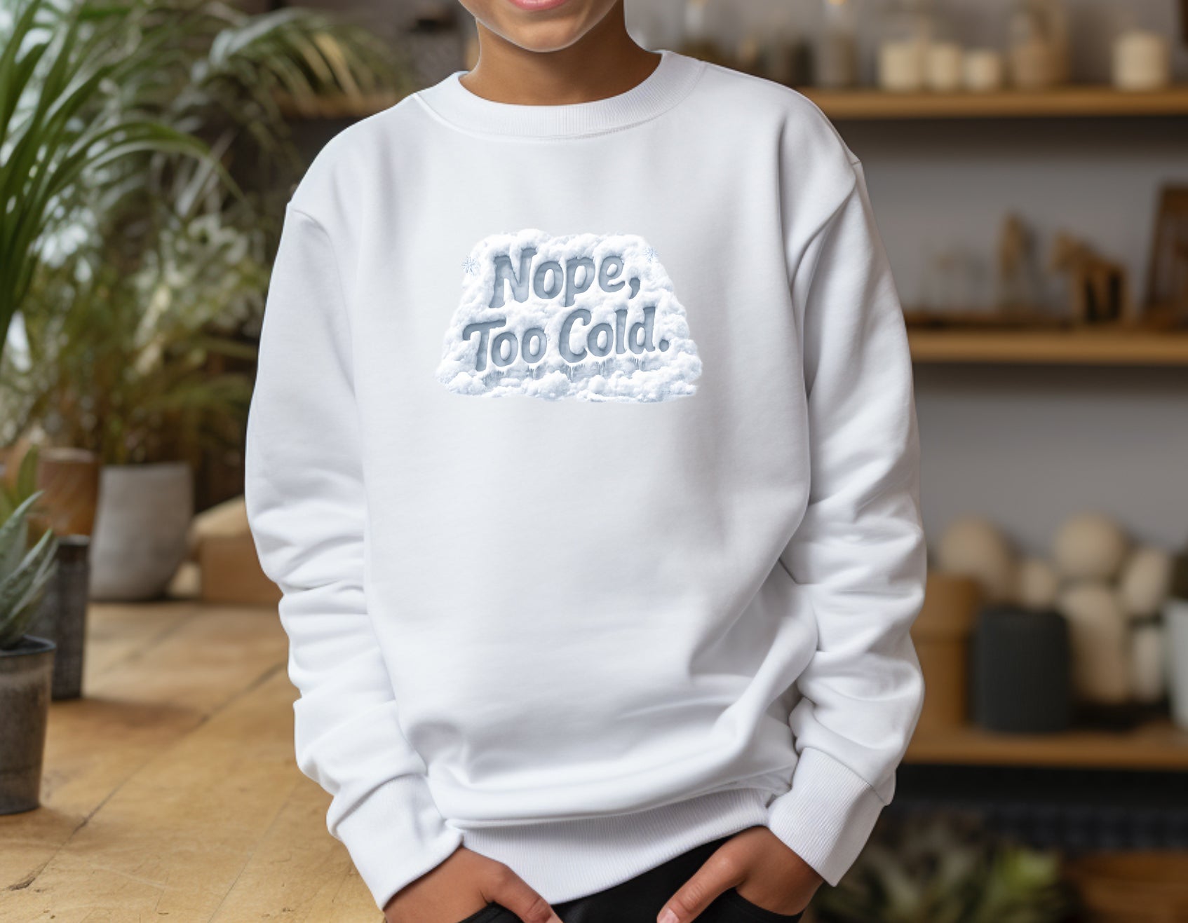 This white shirt features a design that looks like a pile of snow with the words "Nope Too Cold" written in it. Get it in either a sweatshirt or hoodie in unisex sizes.