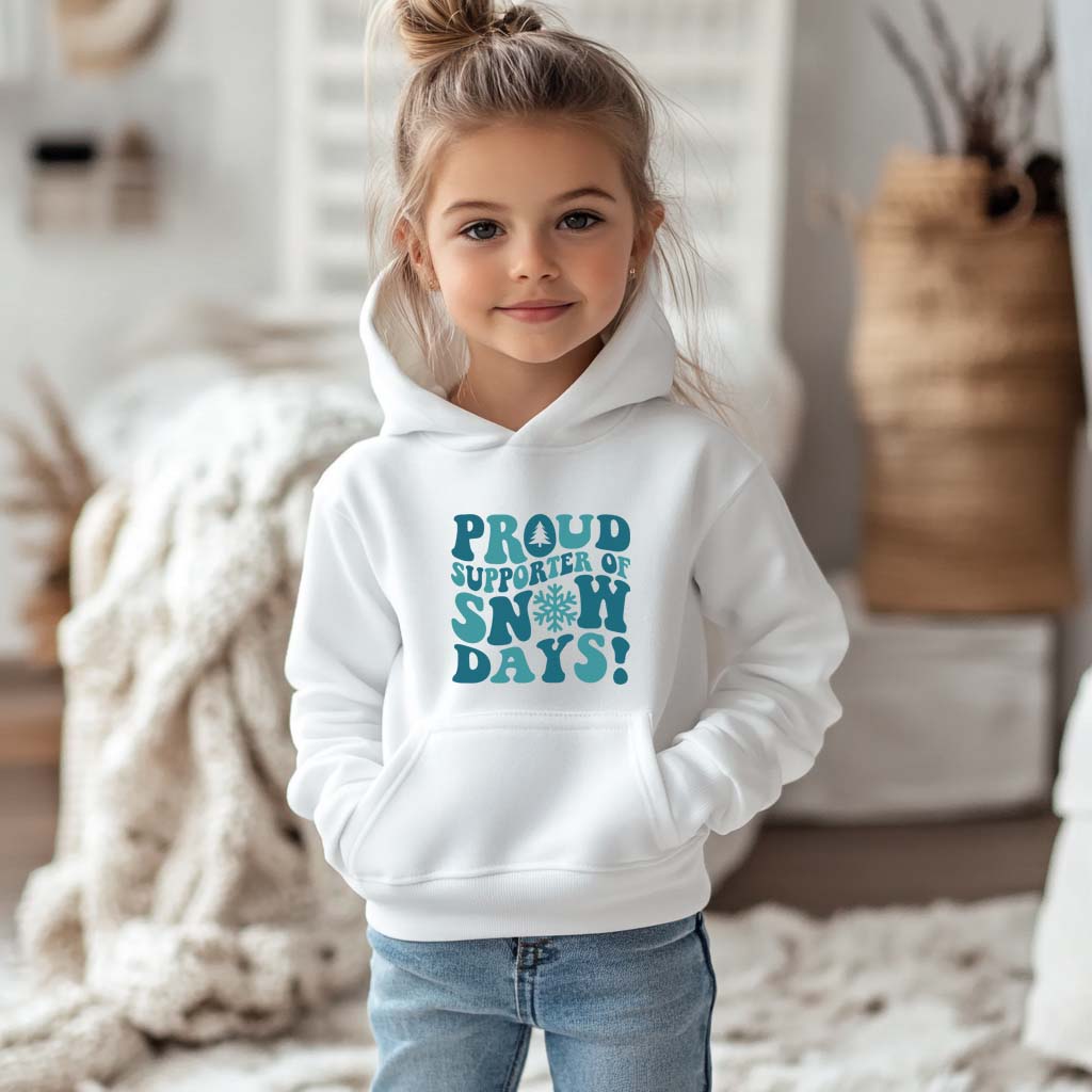 Snow days are the best! Celebrate with this white shirt in either a sweatshirt or hoodie in kids' unisex sizes.