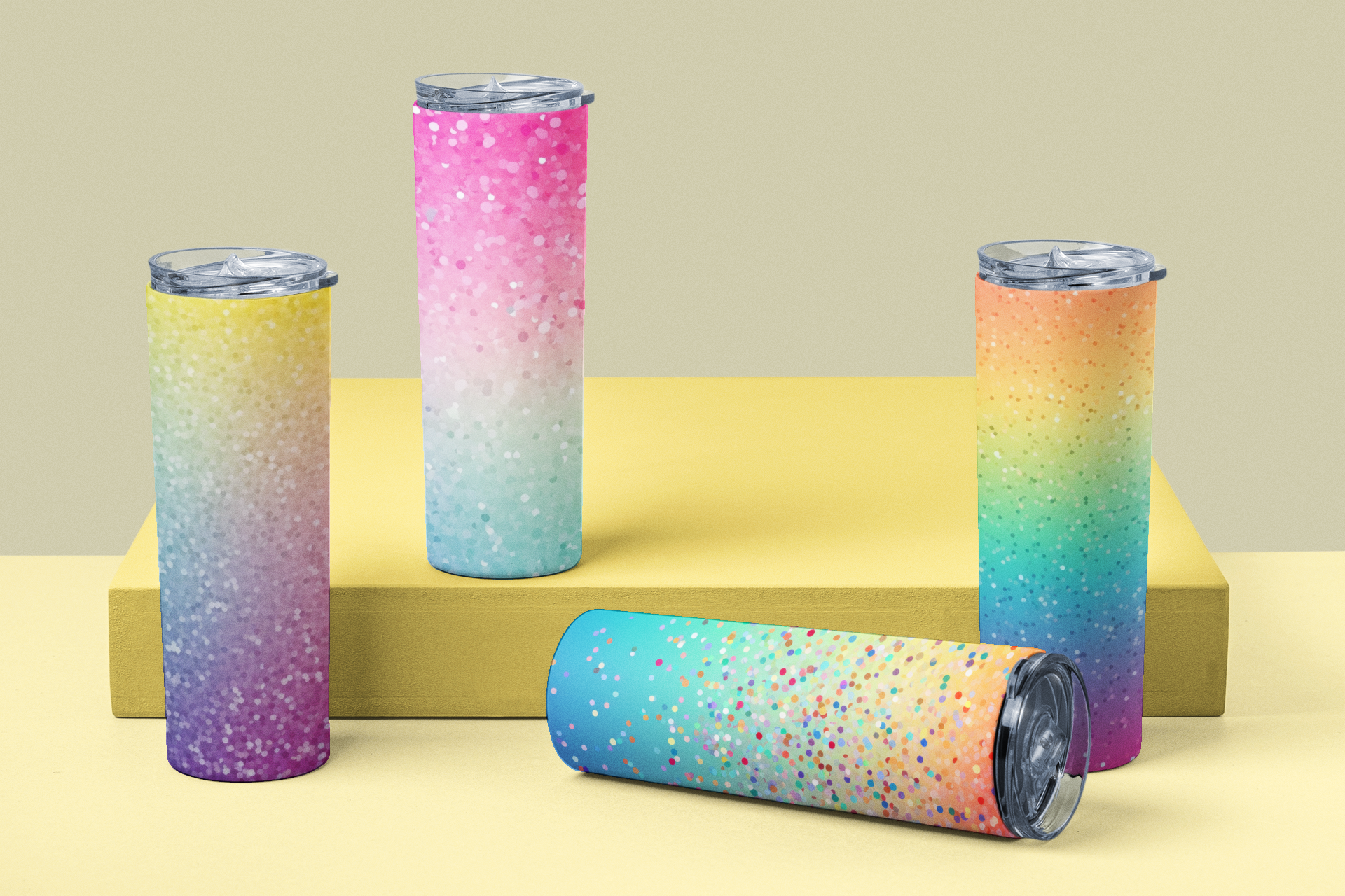 These 20 oz. stainless steel tumblers feature a printed glitter design in a rainbow of colors. (Not real glitter) Choose from 5 different designs.