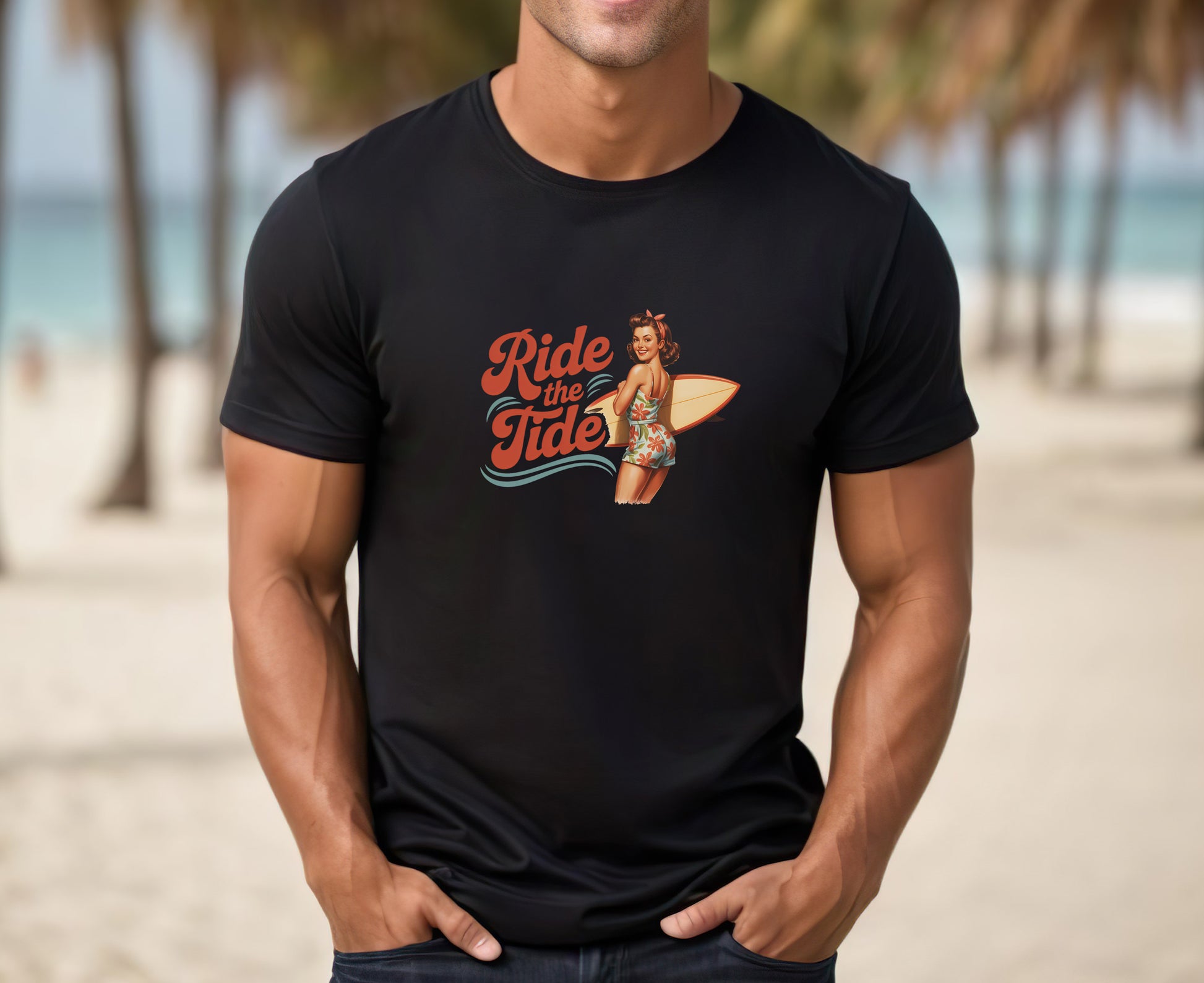 Catch the wave of style with our "Ride the Tide" black shirt, featuring a stunning pin-up girl and surfboard design that embodies the spirit of summer and adventure. Perfect for beach days or casual outings, this shirt combines comfort and flair, making it a must-have for surf enthusiasts and fashion lovers alike. Embrace your inner beach babe and make a statement wherever you go!