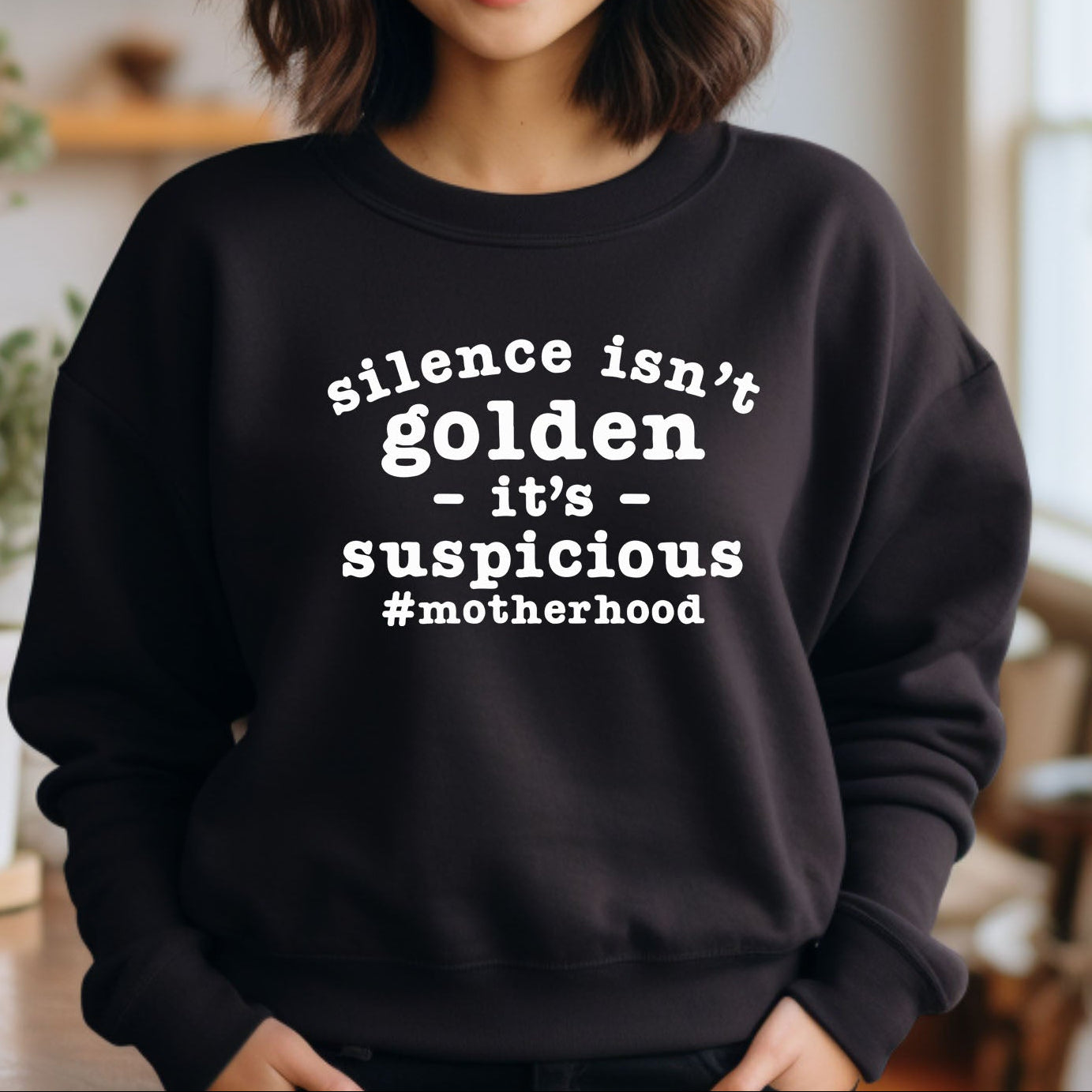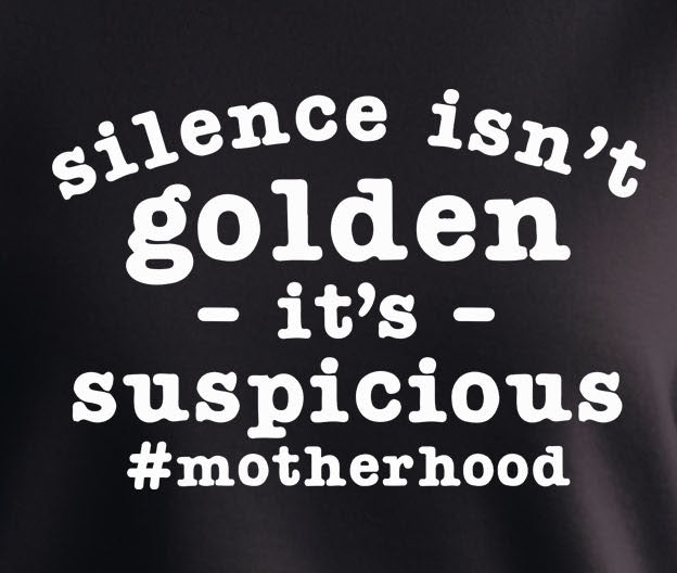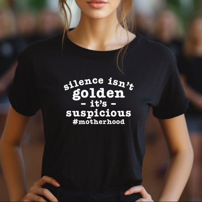 Embrace the humor and reality of motherhood with our "Silence Isn't Golden, It's Suspicious" black shirt. Crafted from soft, breathable fabric, this stylish top is perfect for moms who know that quiet moments often come with a hint of mischief. Its bold statement not only sparks conversation but also showcases your unique parenting perspective. Whether you're running errands or enjoying a well-deserved break, this shirt is a must-have addition to your wardrobe. Wear it proudly and let the world know that motherhood is anything but ordinary!