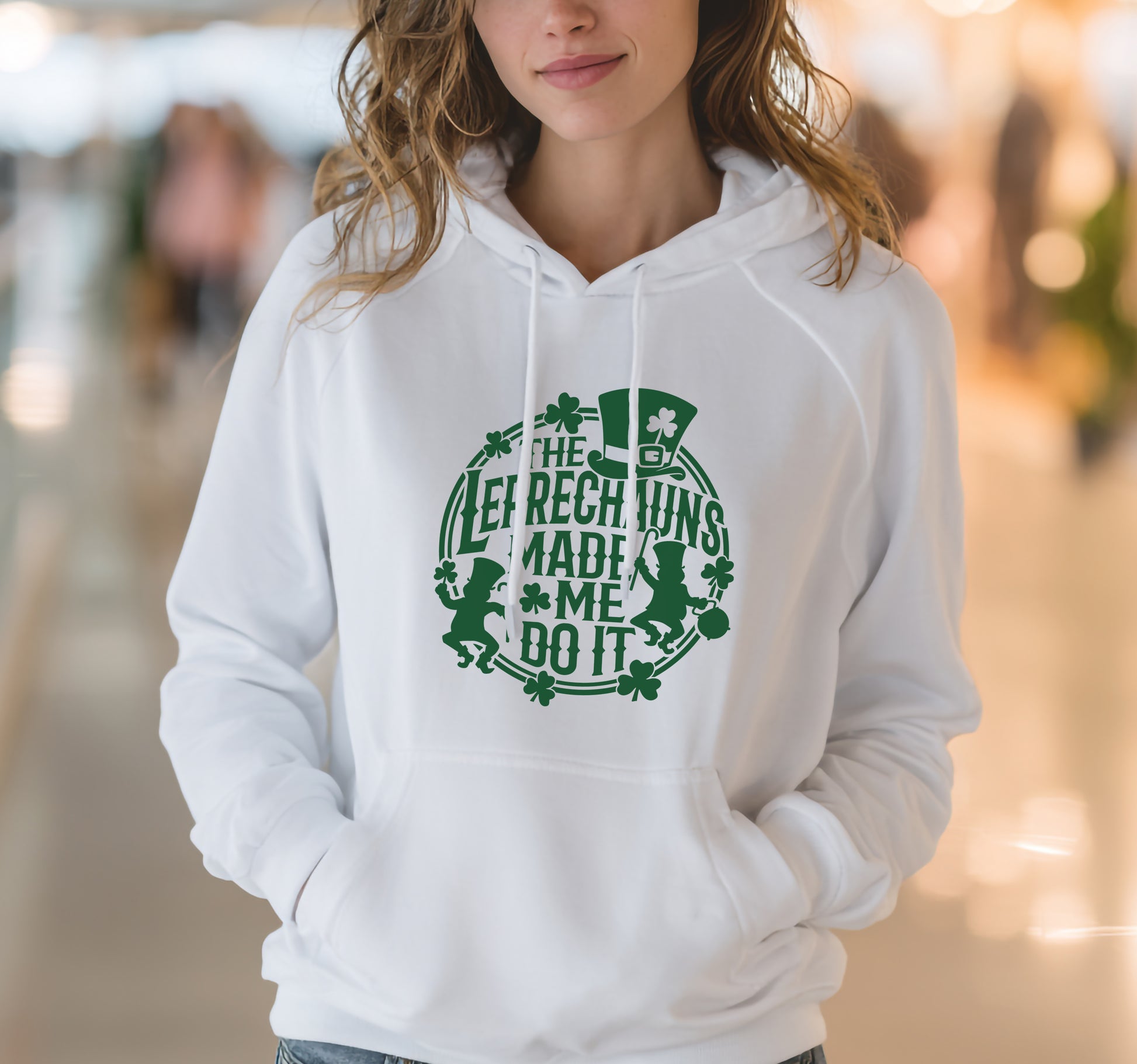 This white shirt features the words "The Leprechauns Made Me Do It" in dark green with two dancing leprechauns, several shamrocks and a top hat. Get it in your choice of a crew neck T-shirt, sweatshirt or hoodie in unisex sizes.