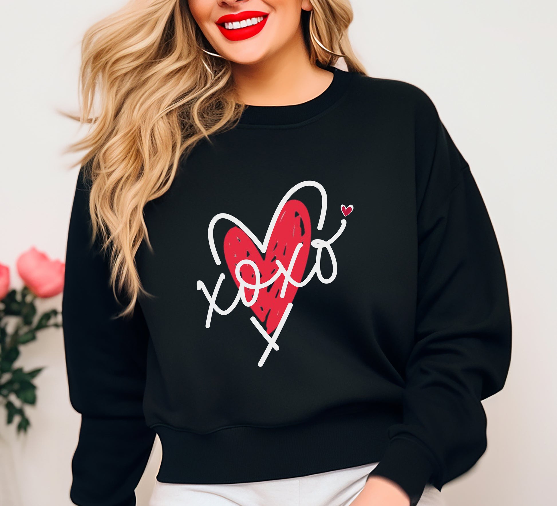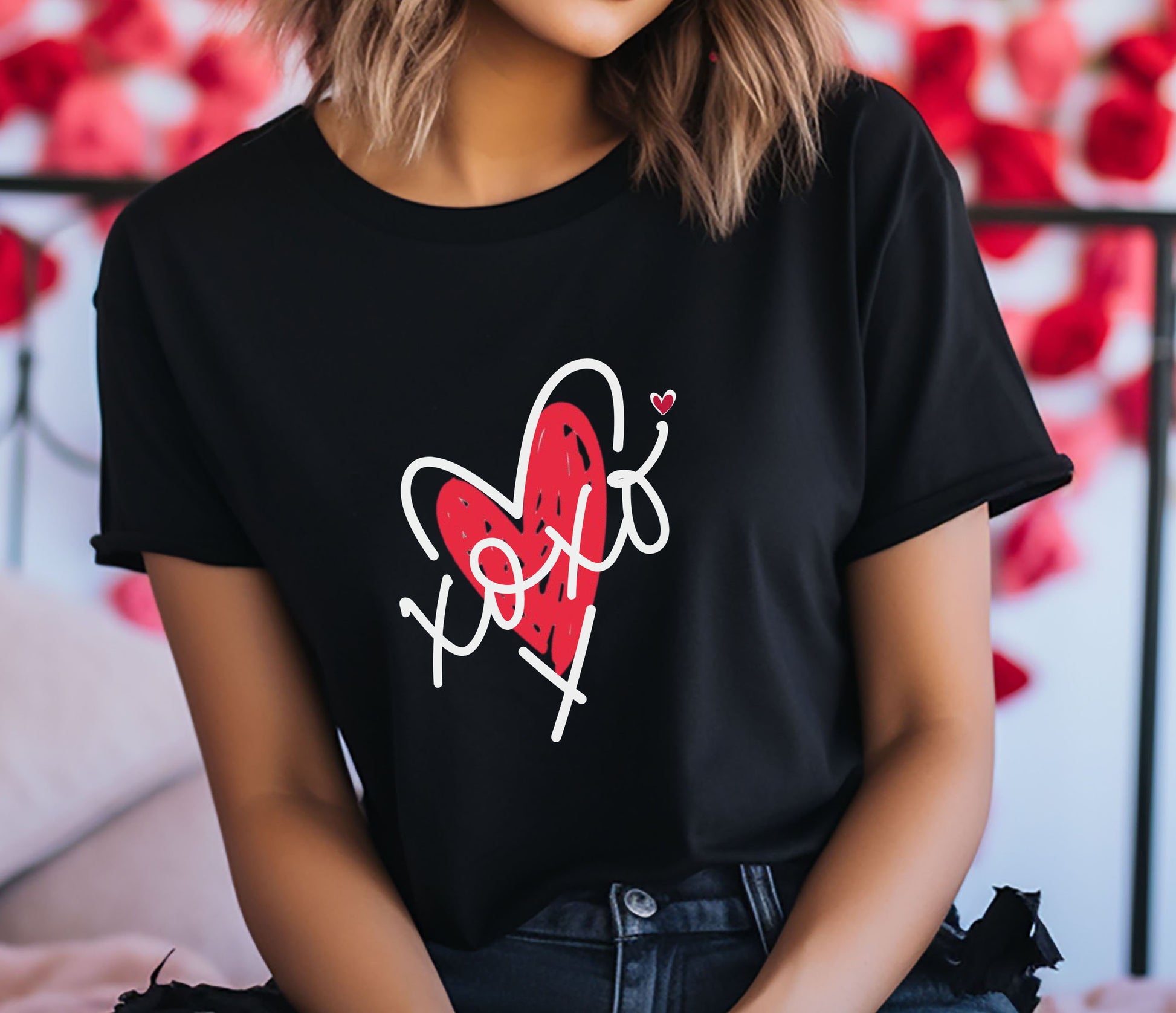 This black shirt features a red heart and the letter "xoxo" in white script. Get it in a crew neck T-shirt, sweatshirt or hoodie in unisex sizes.